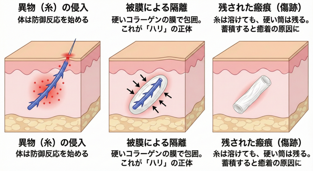 私が糸リフトを拒否する最大の理由は、「異物を体に入れることへの生理的な拒否反応」と、それに伴う「被膜形成(ひまくけいせい)」のリスクです。
